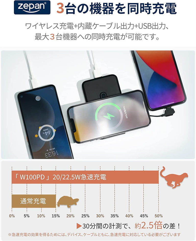 ワイヤレス充電+Lightning(内蔵ケーブル)出力+USB出力で、