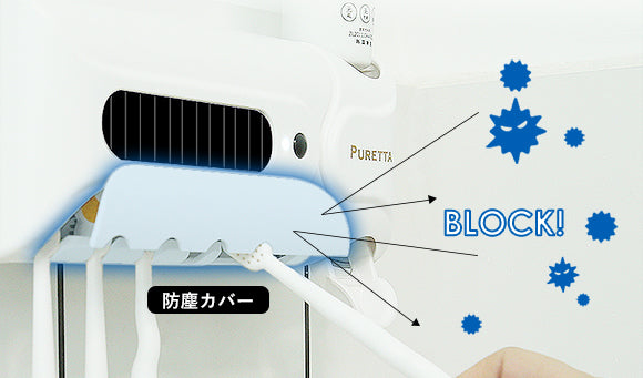 「PURETTA」は指先で簡単に開閉できる防塵カバー付き。殺菌効果を最大限保つためにも、歯ブラシをホルダーに掛けた後はしっかりカバーを閉めてお使いください。