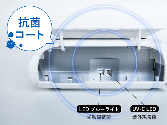 酸化チタンでコーティングされた「PURETTA」は、内部にブルーライトを30秒間照射することで、抗菌効果を発揮、ホルダー内部を常に清潔に保つことが可能です。
