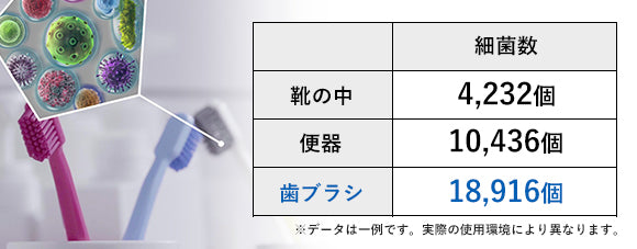 洗浄後の歯ブラシ、コップやスタンドにそのまま置いていませんか?そんな方は要注意。キレイに見えて実は細菌でいっぱいかもしれません。実は、歯ブラシはトイレの便器や靴の中よりも細菌が多いと言われているのです。