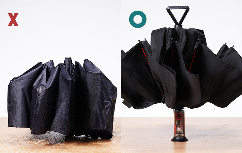 雨水に濡れた傘布が内側になる、逆折り”デザインで周囲を濡らしにくいのが大きな特徴。