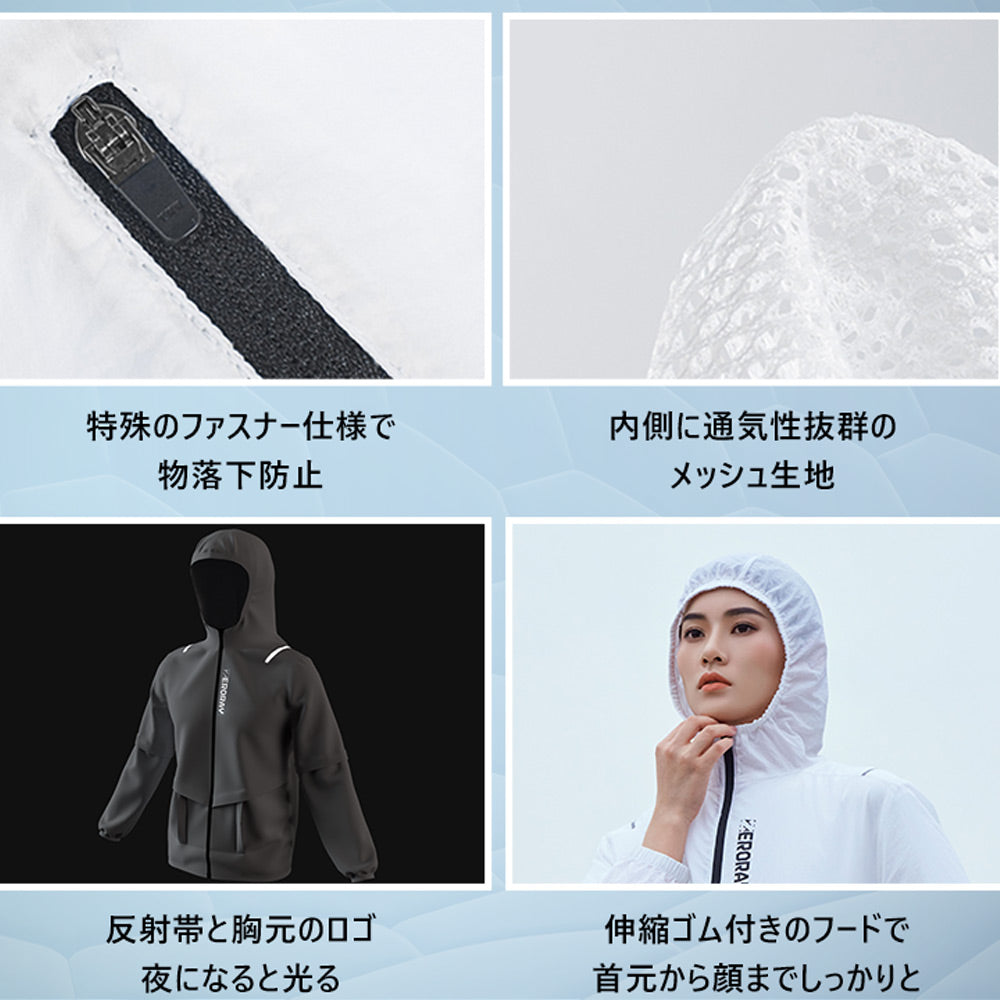 夏を快適に楽しむために誕生しました「ZERORAY」ファン付き送風パーカーは、しっかりした送風、UV対策などの機能だけではなく、最軽量、高通気性、コンパクト収納などあらゆる面から最高の使い心地ができるようにこだわってきました。