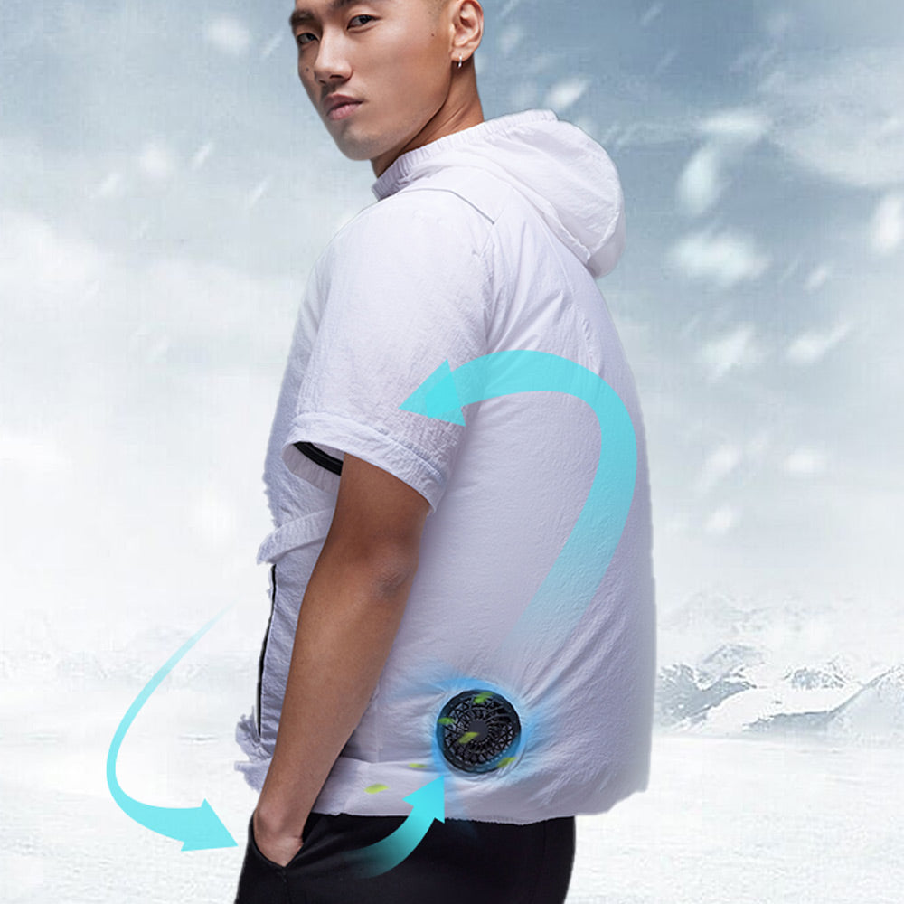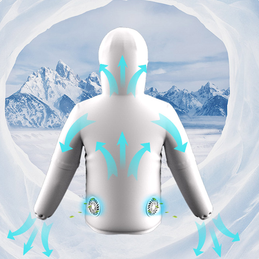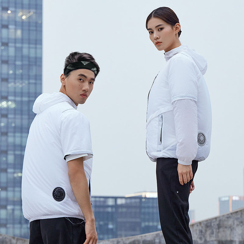 ファン付き送風パーカーを着て、パワフルな涼風が身をまといます。